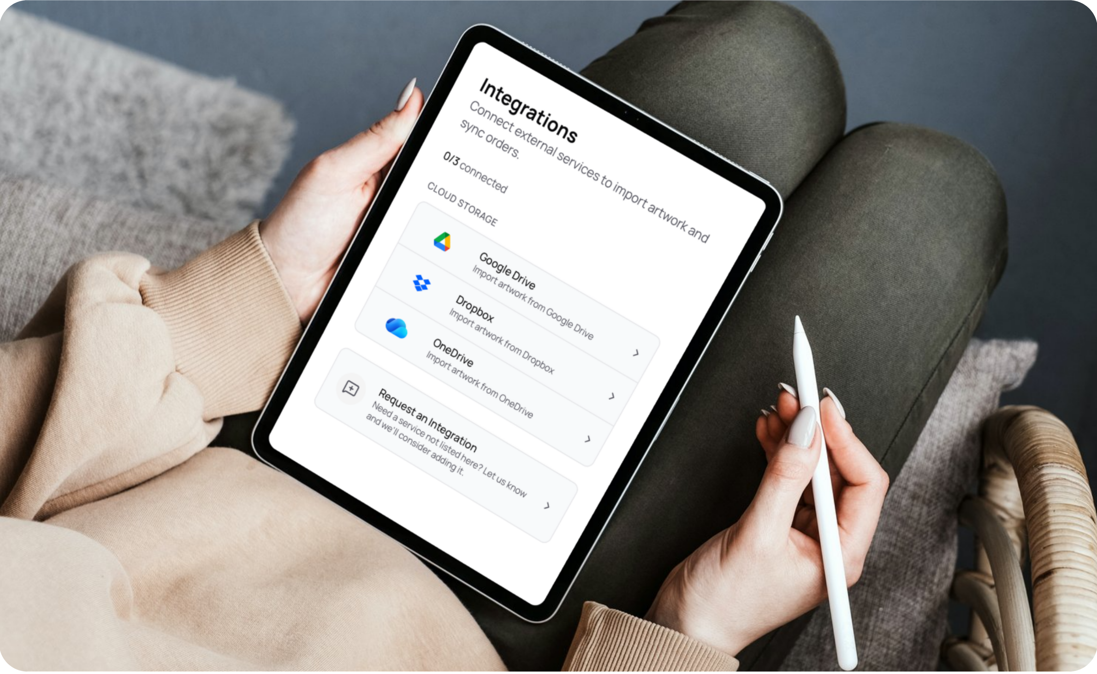 Connect your Google Drive, Dropbox, or OneDrive and pull designs straight into your order. No downloading. No re-uploading. No hunting through folders.